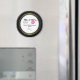 Un imán boda con un diseño boda de estilo moderno: labios glamorosos de besos rosas y un ilustracion masculino de bigote retro. Está situado sobre un fondo negro de pizarra con un marco circular de gradiente dorado en el centro. El texto dice que el señor y la señora y usted pueden personalizar con sus nombres y fecha de boda.