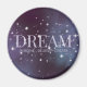 Magnet con las inspiradoras palabras 'sueñar, imaginarse, crear' en letras de mayúsculas violeta pastel frente a un cielo estrellado por la noche en medio de polvorientas nubes violetas y azules en el espacio nebuloso. Mística y mágica como el misterioso reino de los sueños. Utilice la plantilla de texto para agregar un nombre, palabras habilitantes o comillas inspiradoras. ♡ Idyllfire