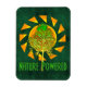 Un símbolo de sol basado en una rueda giratoria sostiene un árbol en el centro con las palabras "Naturaleza Powered". En amarillo, naranja y verde para representar el sol y la tierra y todas las cosas en crecimiento.