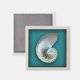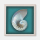 El caparazón interior de un nautilus sobre un fondo verde azulado conjunto en un efecto de caja de sombra con una alfombra beige.