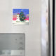 Un imán Navidad con un muñeco de nieve decorando un árbol de Navidad.