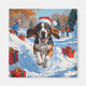 Un ilustracion vacacional reconfortante con un perro alegre jugando en la nieve, usando un sombrero de Santa y rodeado de coloridas cajas de regalos. En el fondo, los niños construyen un muñeco de nieve al lado de un árbol de Navidad cubierto de nieve, creando un alegre maravilloso país invernal. Perfecto para difundir alegría por las vacaciones y capturar la magia de los Navidades.