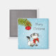 Un imán divertido y lindo con un tema de navidades. Un gatito malicioso y juguetón. Ella está mirando un árbol de navidad que cuelga de una rama de pino preguntándose si debería jugar con él o no. El texto dice Feliz Navidad con una tipografía caprichosa. Está situado sobre un fondo azul con copos de nieve blancos.