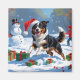 Un ilustracion vacacional reconfortante con un perro alegre jugando en la nieve, usando un sombrero de Santa y rodeado de coloridas cajas de regalos. En el fondo, los niños construyen un muñeco de nieve al lado de un árbol de Navidad cubierto de nieve, creando un alegre maravilloso país invernal. Perfecto para difundir alegría por las vacaciones y capturar la magia de los Navidades.