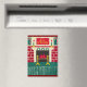 La imagen impresa en el imán es de una foto de una creación original de crochet de tapicería diseñada a mano y derechos reservados © por el diseñador publicado Delores Chamblin. En el imán se reproduce el cuadro de la singular chimenea de ladrillo de color verde oro rojo y de la pared de Navidades blancos colgada de los extremos de hilados.