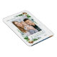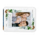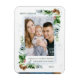 Navidades Imán fotográfico enmarcado con nieve y vegetación de Holly, ramas de pino, conos de pino, bayas rojas. Personalizar con un solo texto y una fotografía.
