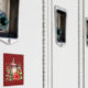 Magnet con una acogedora imagen de Navidad con una linterna roja rodeada de pino y una poinsettia y un hueco.