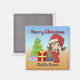 Navidades Toddler Chica Square Magnet presenta un fondo de degradado azul y marrón (personalizable), una linda bebé personalizado con pijama roja con un sombrero de Santa roja, sosteniendo un oso de peluche. También hay un árbol de Navidad decorado con regalos debajo. El texto rojo estilizado es Feliz Navidad. Hay texto configurado para el nombre de su hijo o cualquier texto que desee. ¡Un regalo perfecto para los Navidades! Para personalizar del color de fondo - Borrar la imagen de fondo - Haga clic en el botón Azul "Personalizar", - Haga clic en la "X" junto a la imagen de fondo, luego haga clic en "Editar" y luego en "Fondo", elija su color y haga clic en "Listo". "Gracias a Sweet N Sassy Clipart por el cliente utilizado para crear este diseño. http://sweetnsassyclipart.com"
