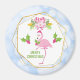 Un caprichoso producto de navidades tropicales. Bokeh azul y blanco, fondo de luces borrosas. Encaramado en la parte superior, dentro de un lujoso marco de Relieve metalizado de oro falso, hay un flamenco rosa elegante con una pierna levantada. Con un sombrero rosa de santa y un matiz decorativo de temporada. Un ramo de flores sobre su cabeza con dulces cruzados juntos