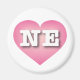 Este imán presenta un corazón rosado con un centro lavado de blanco que contiene las letras negrita, blanca y alta del funda NE, la abreviatura oficial de Nebraska, el estado cascarilla.