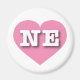 Este imán presenta un vibrante corazón rosado que contiene las letras negrita, blanca, funda superior NE, la abreviatura oficial de Nebraska, el estado del aroma del maíz.
