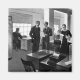 Ilustración vintage en blanco y negro de una escena de oficina empresarial típica con hombres de negocios, mujeres de negocios, hombres, mujeres y trabajadores administrativos realizando su monótona tarea diaria de papeleo y tareas administrativas en sus escritorios. Máquinas de escribir manuales, impresoras y máquinas de fax están en uso.