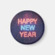 A vibrant and celebratory seasonal graphic featuring the phrase "HAPPY NEW YEAR" in glowing neon-style lettering. The word "HAPPY" and "YEAR" are rendered in a warm, bright orange-red neon, while "NEW" stands out in a brilliant electric blue. The text is centered against a dark, atmospheric night sky filled with the wispy trails of a large, golden firework explosion.