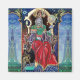 Colorido, vibrante , pintura contemporánea en oro, azul, rojo, verde, marrón . Un misterioso hechicero hipnótico con elegantes trajes de terciopelo rojo que sostienen una mágica esfera sentada en un trono gótico con gargantas y un búho. El ambiente es surrealista, fantástico, alquímico, donde se ve a un bufón bebiendo de una taza, un monje templario volando sobre una rana, burbujas transparentes, paisajes fantásticos con fuego infernal, cielo azul cósmico con estrellas, montañas del cielo, árboles. Huevo Tempera en un panel de madera con Relieve metalizado dorado. 1989 , Miniatura Hecha con técnicas pictóricas de 1300 por Alessandro Lumini (c) También es un hermoso diseño de fantasía para Navidades, vacaciones, cumpleaños, día de Nochevieja, Mardi Gras y saludos de carnaval.