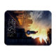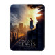 BROMAS FANTÁSTICAS Y DÓNDE ENCONTRARLAS™ | Este poster de películas de la puesta del sol presenta a NEWT SCAMANDER™ parado al lado del agujero gigante roto en el costado de un edificio de una bestia fantástica escapada, por encima de ver el tren cercano mientras pasa.