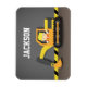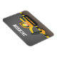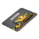 Un lindo niño constructor con casco de seguridad y chaleco naranja brillante conduciendo una excavadora naranja, amarilla y gris en una obra. Hay franjas inclinadas amarillas y negras en el fondo que suelen encontrarse en zonas y obras en construcción. El diseño tiene un efecto de sombra que lo hace destacar. Ideal para niños que aman los temas de construcción y vehículos. Personaliza con el nombre del niño para hacerlo único para él.