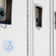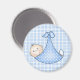 Un fondo azul pálido a cuadros con un bebé bañado en una manta azul sobre botones de bebé y imanes de personalizable, perfecto para duchas de bebé o para anunciar la llegada del recién nacido.