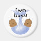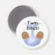 El texto de estilo infantil dice "¡Niños gemelos!" en botones de invitación para bebés e imanes con dos bebés afroamericanos en una manta verde!