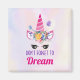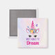 Un imán de plástico con una cita inspiradora que dice: No olviden soñar. Diseñado con un unicornio rosa de moda. Decorado con un elegante cabecero de flores. Mariposas caprichosas volando por ahí. Fondo de color púrpura pálido, rosa y amarillo.