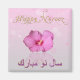 Noble y elegante ilustracion de Año Nuevo persa: Un hibisco rosa florece con deseos de Año Nuevo en inglés y farsi en un contexto bokeh.