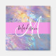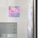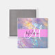 Nombre de monograma de iridiscente holográfico de color rosa, melocotón y agua y imán inicial. Su nombre personalizado y su monograma están escritos en un guión elegante con letras a mano con un fondo rosado. ¡Un regalo perfecto de cumpleaños o Navidades!