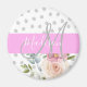 imán de moda y monograma giratorio con flores primavera floral rosa y melocotón y fondo blanco con puntos de polka gris. Su nombre y monograma personalizados están escritos en un elegante guión gris y blanco con letras a mano con un fondo rosado. Puede cambiar el color del texto y el estilo y el tamaño del tipo de letra mediante la opción personalizar.