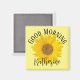 Fotografía de un girasol amarillo brillante con el texto "Buenos días (nombre personalizado)" sobre fondo amarillo claro.