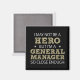 Puede que no sea un héroe, pero soy un gerente general tan cercano al arte de palabras humorísticas en sans-serif y doodle cross-hatch con letras de letras en blanco y amarillo dorado.