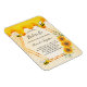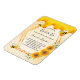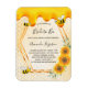 Elegante, divertida y rústica invitación a la ducha con imán de verano. Un fondo amarillo con un patrón de peine de miel. Con un marco geométrico de oro falso y goteo de miel dulce. Decorada con girasoles amarillos y naranjas y abejas felices. Con el texto: Novia a Abeja y el nombre de la novia en el frente escrito con un moderno guión de estilo con letras a mano. Cartas negras. Puede utilizarse como recordatorio de fecha para los invitados. Parte posterior: patrón amarillo de abeja, diseño postal. Sugerencia: Si no desea que se vea como una postal, haga clic en personalizar, vaya a la parte posterior y quite el separador y el sello postal.