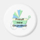 Un carruaje para bebés en azul, verde y amarillo que dice "Nueva abuela orgullosa" en los botones de la invitación para bebés.