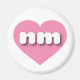 Este imán presenta un vibrante corazón rosado que contiene las letras negrita, blanca, redondeadas de funda inferior nm, una abreviatura juguetona para Nuevo México, la tierra del encanto.