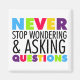 El brillante diseño de texto multicolor dice "Nunca dejen de hacer preguntas y maravillas" en camisetas de mensajes inspiradores, imanes, botones, bolsos de té, tarjetas, pegatinas, cadenas de llaves, tabletas, botellas de agua y mucho más. ¡Estos mensajes motivacionales son excelentes para los profesores y otros profesionales de la educación!