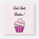 Por la alegría de hornear. La imagen es una tarta de diseño, con el lema "Get Set, Bake" en escritura negra arriba. El funda de quequitos está pintado en dos tonos rosados y los remolinos de hielo son de color rosa azucarado. El diseño se completa con un fondo de color rosa más pálido.