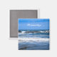 Un imán cuadrado con una fotografía tomada en la costa de Oregón del hermoso océano Pacífico azul, olas estrellándose sobre la arena y rocas amordazadas. Personalice agregando su nombre. Perfecto para los amantes de la playa