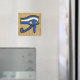 Imán con el símbolo egipcio antiguo, el ojo Horus en los jeroglíficos. Este diseño presenta el Ojo de Horus en contornos azules, amarillos y negros sobre un fondo jeroglífico.