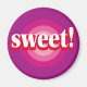 En este imán, el diseño es un ojo de toro rosa y morado con la palabra "dulce" en el centro.
