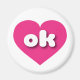 Este imán presenta un vibrante corazón rosado caliente que contiene las letras fundas más bajas negrita, redondeadas y blancas, ok, una versión juguetona de la abreviatura de Oklahoma, el estado anterior.