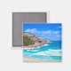 Unas olas suaves en un mar azul profundo, unas rocas y un cielo azul brillante traerán una hermosa vibración veraniega a su frigorífico sin importar la temporada.