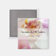 Atractivo imán boda de orquídeas blancas y rojas oscuras personalizado con sus nombres y fecha.