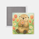 Un imán con un ilustracion acuarela de una divertida nutria marina sosteniendo una flor rosada de margarita, con tulipanes primaverales y margaritas blancas a su alrededor