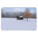 paddock cubierto de nieve con cobertizo y árbol rodeados por el bosque