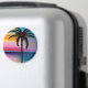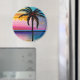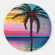 Colores azules, rosas, naranjas y violetas, silueta de palmera y olas oceánicas en una playa de arena artificial generadas por arte.