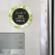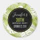 Imán de cumpleaños con un patrón repetido de hojas de palmera grandes sobre un fondo verde oliva. Moderno y tropical. Un círculo negro con un borde interior dorado sobre la parte superior con tus detalles personalizados en el interior.
