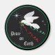 ¡Brilla por tu casa o tu oficina con este imán refrigerador de "One of a Kind"! Con una serena paloma blanca que vuela entre las estrellas llevando una rama de olivo con cintas rojas y verdes que flotan... ¡Difundiendo "Paz en la Tierra"! Este es un Diseño de Arte Original del artista Kerry Miller.