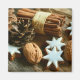 El diseño presenta una fotografía temática Navidad de palos y estrellas de canela, así como conos de pino y nueces en el caparazón.