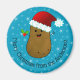 Navidades felices Papa vistiendo un sombrero rojo de Santa con un guarnecido de piel blanca y un títere blanco esponjoso. Su cuerpo es marrón con pequeños puntos negros para los ojos y una gran sonrisa feliz. Tiene palos para los brazos y está sosteniendo hojas verdes con bayas rojas. Detrás de él hay un fondo azul con copos de nieve brillantes blancos. Debajo de la papa hay una plantilla de tipo negro para que añada tu propio texto para personalizar este imán de Navidades.