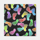 Ilustracion de muchas huellas coloridas con caras sonrientes felices pisoteando sobre un fondo negro. Imagen disponible en varios regalos y productos.