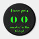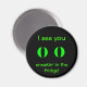 Este es un imán redondo de refrigerador negro con ojos de neón verde sobre él y las palabras "¡Te veo, escondiéndose en el refrigerador!" Gótico lindo divertido que se mezcla bien con Halloween. Tengo que mantener el control con todos esos deliciosos dulces oscuros.