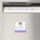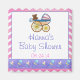 Imán de favor de fiesta personalizable o imán de aviso de Pink Chevron y Purple Baby Shower de ITD Colors Galore presenta nuestro arte original de un colorido cochecito de bebé antiguo con un oso de peluche dentro en la parte superior del cuadrado blanco con la ducha de bebé de "Hanna" y la fecha en el medio. Asegúrese de personalizar el nombre y la fecha. En la parte inferior hay una banda morada con nuestra textura de firma con un patrón de sonajero y chupete que corre a través de ella.