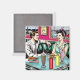 Imán retro del estilo de las historietas de arte pop. Una pareja de la época de los años 50 que se sienta en una cena con batidos, patatas fritas y hamburguesas de queso en una cita. Los colores utilizados son verde azulados, rosa, rojo, negro y amarillo. Nostalgia anticuada. Esta foto la dibujamos a mano yo mismo.